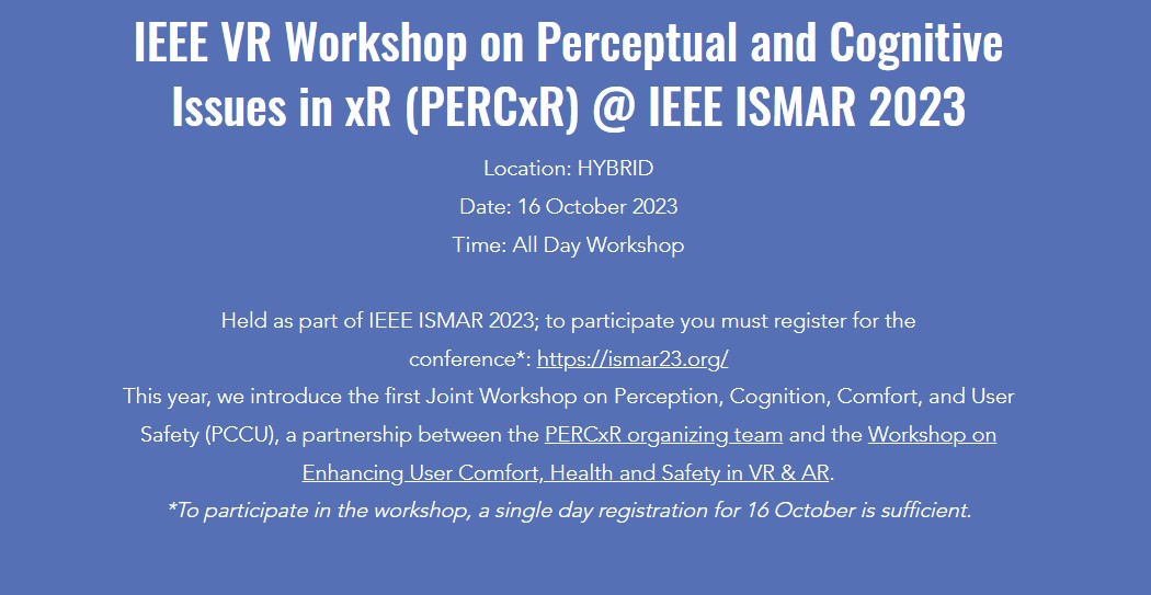 The IEEE ISMAR 2023 Workshop on Perceptual and Cognitive Issues in xR (PERCxR) is the eighth installment of the previous successful PERCAR workshops held at the IEEE VR conferences 2015-2020, and the PERCxR workshops held at IEEE ISMAR 2021-2022 and IEEE VR 2022. This year, we are joining forces with the Workshop for Enhancing User Comfort, Health and Safety in VR and AR. As a result, we will be accepting papers related to human perception, cognition, comfort, health, and safety for xR systems.